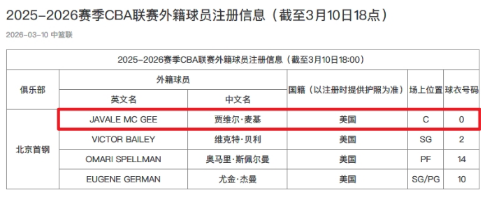 北京时间3月10日,CBA官方公布最新外援注册情况,北京男篮已经为前NBA3冠中锋麦基完成注册,他将身穿0号球衣征战CBA第二阶段的比赛,有望在3月11日对阵四川男篮的比赛迎来加盟首秀。