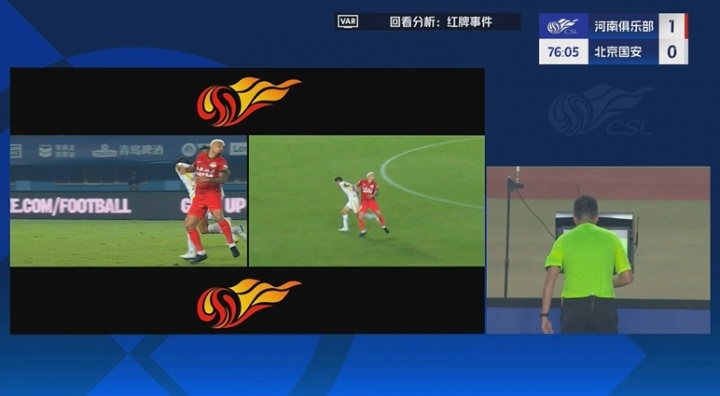 比赛第77分钟,王刚无球状态下击打卡多索面部,主裁判看过VAR后对其处以黄牌警告。